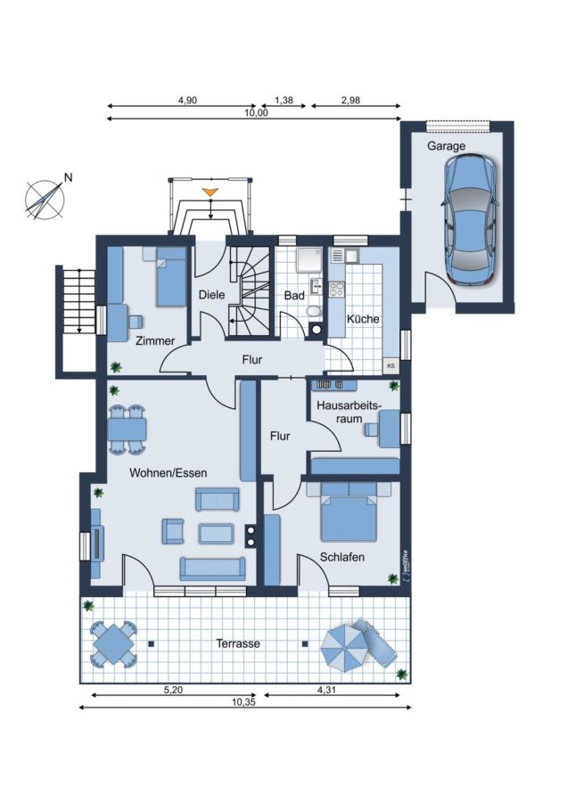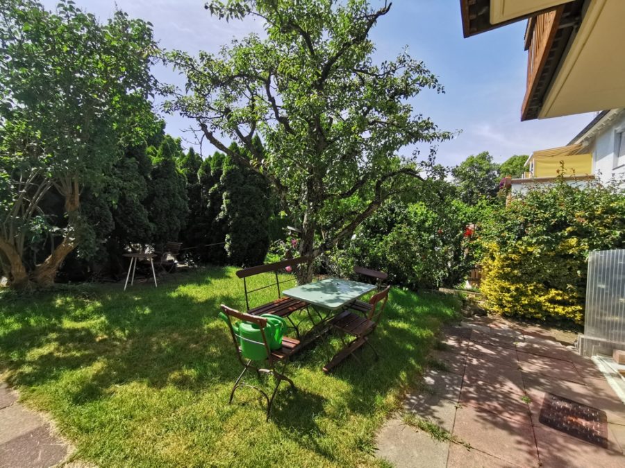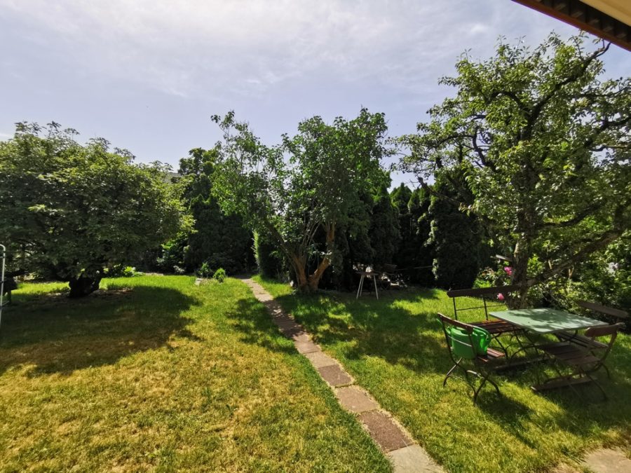 Die große Terrasse mit dem angrenzenden Grundstück, auf dem derzeit mehrere Obstbäume stehen wird sie begeistern.
