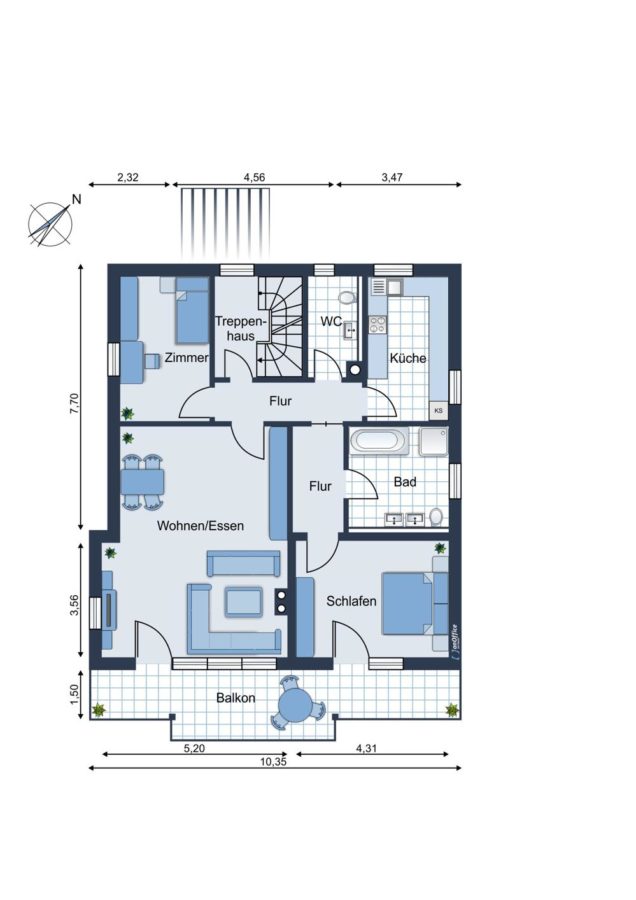 Es befindet sich im EG und im OG jeweils eine 3,5 Zimmer Wohnung mit ca. 104 m² Wohnfläche, hier besteht Modernisierungsbedarf auf Grund des aktuellen Zustandes.