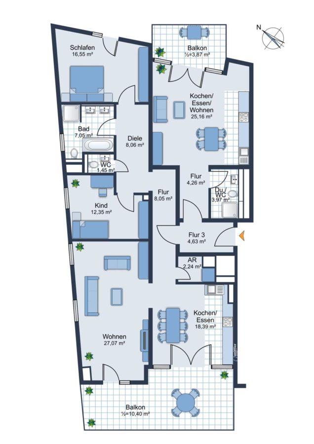 Die Wohnung verfügt über drei Schlafzimmer.Das Besondere an dieser Wohnung ist, dass ein separates 1-Zimmer-Apartment mit ca. 38 m² mit Bad und Balkon über einen Flur mit der 3,5-Zimmer-Wohnung verbunden ist. Ebenso besteht dort die Möglichkeit eine Küchenzeile zu integrieren. Dies ermöglicht sowohl eine separate Vermietung als auch eine Nutzung als zusätzlicher Wohn-Schlafbereich für die große Familie.Die separate großzügige Wohn-Küche in der 3,5-Zimmer-Wohnung sowie das lichtdurchflutete Wohnzimmer haben beide einen Zugang zur 20 m² großen Dachterrasse.
